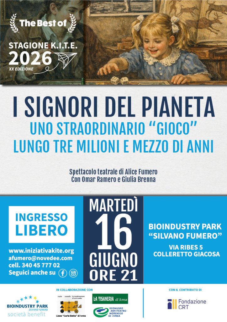 Siete pronti per un gioco che vi accompagnerà in una passeggiata lunga tre milioni e mezzo di anni, dalle origini dell’uomo ai giorni nostri? Quella dei nostri antenati non è stata però un’avanzata solitaria e lineare, bensì una lunga convivenza -in certi casi una competizione- con le altre specie di ominidi che già popolavano i continenti milioni di anni prima della comparsa del genere homo. Poi, nel giro di poche decine di migliaia di anni, qualcosa è successo; qualcosa di potente, così potente, inaspettato e rivoluzionario da permettere a homo sapiens di rimanere unica specie umana sopravvissuta, rendendoci così, davvero, ‘i signori del pianeti’. Ma cosa ci rende unici?! Questo spettacolo sarà come prendere parte ad uno straordinario gioco che ci condurrà in un viaggio nel tempo alla scoperta della essenza dell’umanità…